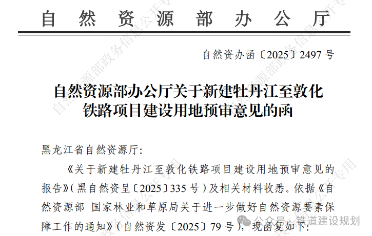 2025/11/0310月30日,自然資源部辦公廳印發(fā)《關(guān)于新建牡丹江至敦化鐵路項(xiàng)目建設(shè)用地預(yù)審意見(jiàn)的函》,牡敦高鐵黑龍江段用地預(yù)審正式獲國(guó)家批復(fù),為項(xiàng)目可研批復(fù)奠定了基礎(chǔ)。根據(jù)意見(jiàn)函:“新建牡丹至敦化鐵路項(xiàng)目(項(xiàng)目代碼:24...