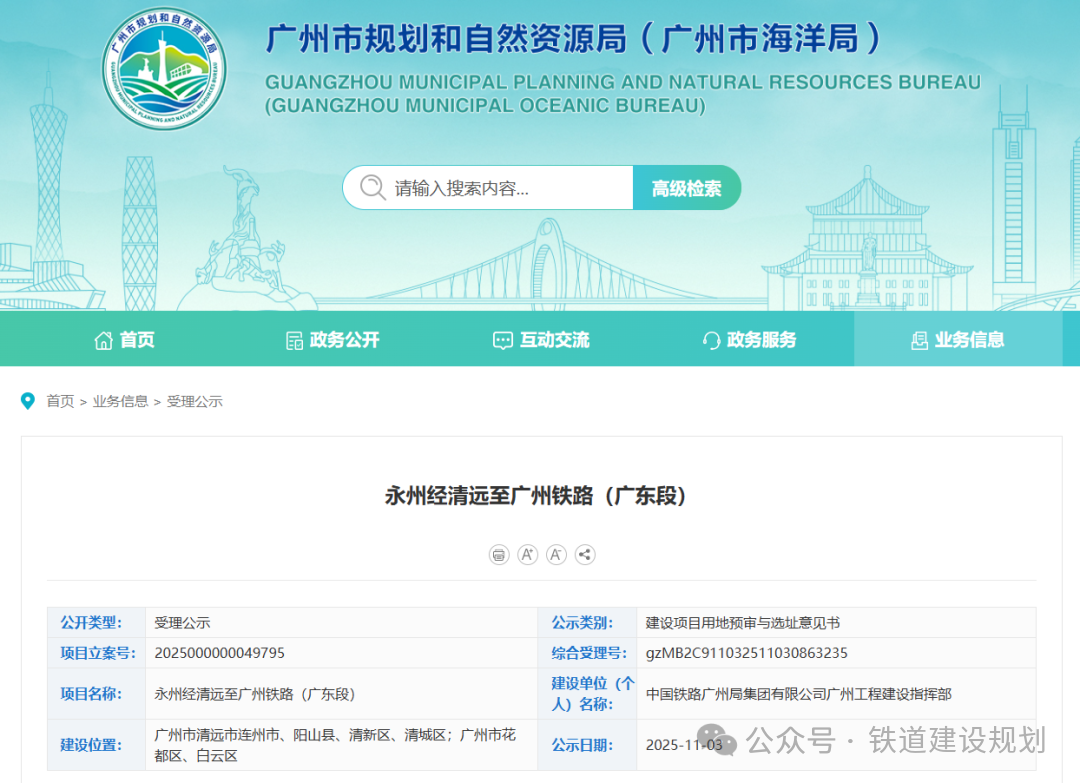 2025/11/17近日,廣州市規(guī)劃和自然資源局正式受理了永州經(jīng)清遠(yuǎn)至廣州鐵路項(xiàng)目(廣東段)用地預(yù)審與選址意見(jiàn)書(shū)。項(xiàng)目用地預(yù)審與選址進(jìn)入審批階段,將力爭(zhēng)在年底前批復(fù)可研。根據(jù)項(xiàng)目可研方案:永州經(jīng)清遠(yuǎn)至廣州鐵路自在建邵永鐵...