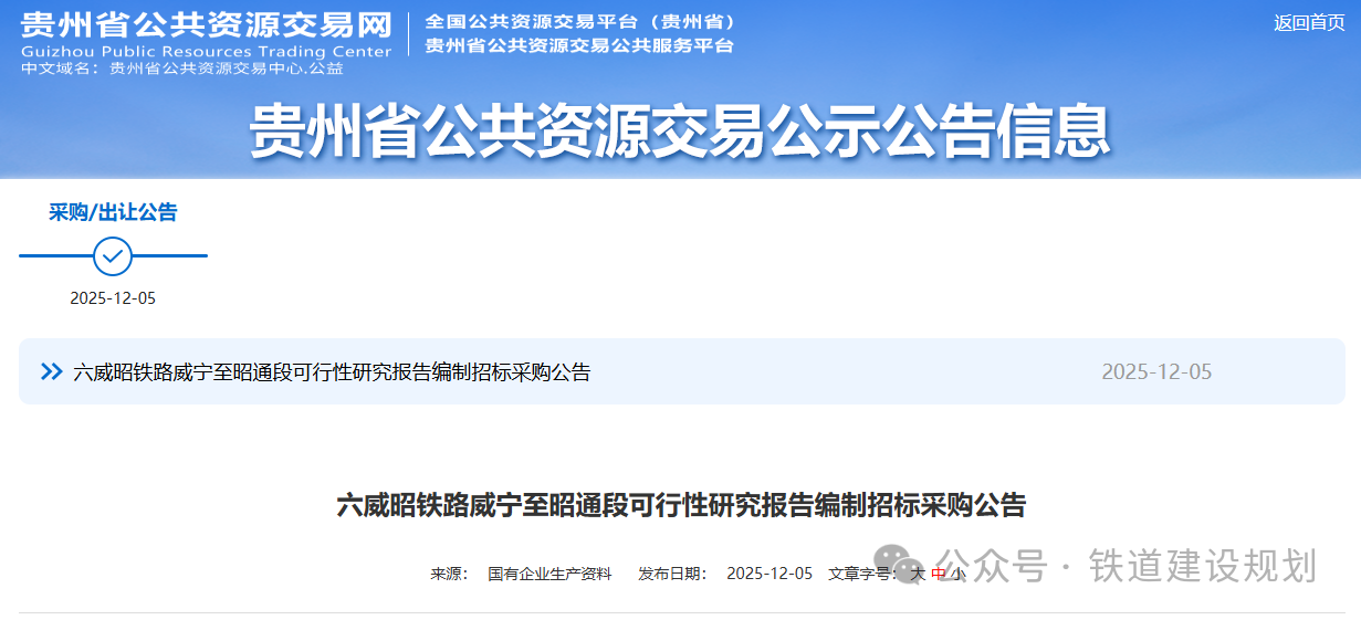 2025/12/0812月5日,六威昭鐵路威寧至昭通段可行性研究報(bào)告編制招標(biāo)采購(gòu)公告在貴州省公共資源交易網(wǎng)發(fā)布,招標(biāo)人為貴州鐵路投資集團(tuán)有限責(zé)任公司。根據(jù)公告:六威昭鐵路項(xiàng)目位于貴州省六盤(pán)水市、畢節(jié)市、云南省昭通市,線(xiàn)路自貴...